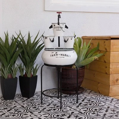 Add some old-fashioned charm to your home with this vintage-looking 36″ tall White Buckets with Faucet Tabletop Fountain Decoration from Alpine Corporation. This fountain statue provides a tranquil and addition to your porch, backyard, or sunroom. Constructed from durable iron with a classic and antique look, the fountain is weatherproof and resilient. This statue will bring a touch of rustic charm to your outdoor space. Relax to the sounds of the soft, natural water flow as it trickles down through the buckets. Not only will the fountain provide you with serenity, it will also add a breathtaking display of beauty and retro charm to your outdoor area. This charming fountain provides a lovely throwback style to your courtyard, and gives your garden visual interest with its timeless design and classic style. For quick installation and convenient operating, the water fountain includes all necessary parts and a pump to begin creating an outdoor oasis. This decorative water fountain measures 15″L x 15″W x 36″H to fit almost any outdoor space and includes a one-year manufacturer’s warranty from date of purchase. Alpine Corporation is one of America’s leading designers, importers, and distributors of superior quality home and garden decor products. Alpine’s award winning in-house design team continuously develops new and innovative “statement pieces” for your home and garden. Your outdoor living spaces will be the envy of the neighborhood with our wide assortment of fresh, fashionable and contemporary products, from beautifully crafted solar garden stakes featuring patented motion and fiber optic lighting technology to gorgeous glass and glow-in-the-dark birdbaths and feeders.