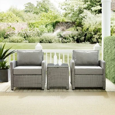 Outdoor relaxation has never looked better than with the Bradenton 3pc Chair Set. The sturdy steel frames are wrapped in beautiful all-weather wicker and topped with moisture-resistant cushions. With gently arched arms and deep seating, the Bradenton armchairs are stylish and comfortable, while the glass top side table makes outdoor entertaining a breeze.