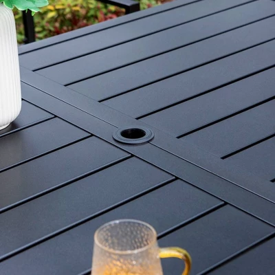 The chair is the amazing combination of a sturdy Aluminum frame and quick-drying Sling fabric. The steel table is well made and a nice touch for decorations. This dining set fits perfectly in outdoor space, such as patio, pool, backyard, garden, covered porch, balcony, deck, etc..Enhance your outdoor living space with this outdoor furniture!