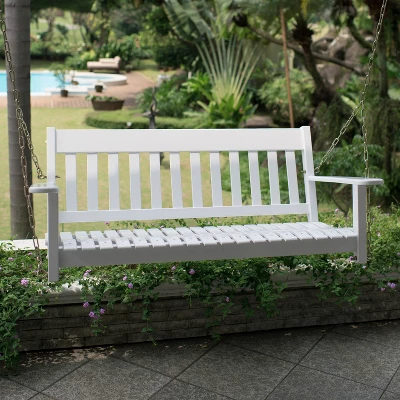 Feel at ease outdoor with this Alston Porch Swing from Cambridge Casual. A fun patio piece for your porch, Alston swing features slatted wood design, with deep contoured seat for added comfort. Crafted from fine-quality solid mahogany wood and weather-resistant hardware, this piece is easy to clean and will stay beautiful through the seasons. You can relax with a good cup of coffee and your loved one for nice afternoon chill or spend alone time for yourself with a good read.