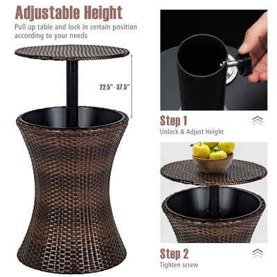 With the metal frame, its weight capacity in ascending state reaches 44 lbs and weight capacity in descending state reaches 110 lbs. Equipped with 4.5Gal capacity, you can store a lot of ice and drinks in the ice bucket. Plus, the overall height is adjustable from 22.5” to 37.5” which makes the patio cooler bar table adaptable to different occasions, such as poolside, beaches and bars. If you are worried about the cleaning, then please rest assured. There is a steel drainage plug to quickly drain excess water. And the assembly is also very simple with the detailed manual.