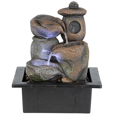 This Asian, Japanese-style petite tabletop fountain fits anywhere! Welcome a peaceful, meditative, natural look fountain to add soothing sounds, serene Fung Shui energy and elevate health. It’s mesmerizing to watch the waterfall as sparkling water quietly moves from the zen pagoda toward the underwater LED lights that emit a soft glow. Cast in quality designer resin and hand-finished to replicate natural stone, this Design Toscano lightweight, portable, and easy-to-set- up fountain also features a UL-listed indoor/outdoor pump. It’s ready the moment you add water and plug it in! 8½”Wx7″Dx10″H. 5 lbs.