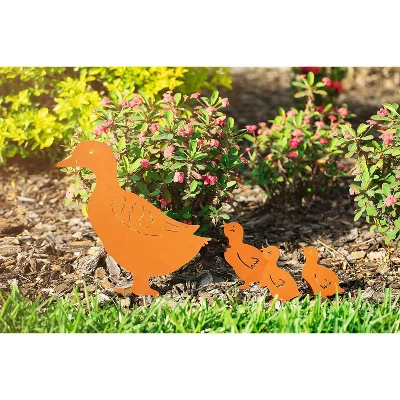 Bring Homarden’s Family of Silhouette Ducks to your outdoor space. This set of 4 metal ducks includes 1 momma duck and 3 babies. Each rust-colored duck is crafted with laser-cut technology for feather, eye, and beak details. The large duck measures 10 x 7 inches, and the 3 smaller ducks measure 4 x 2 inches. Each duck is attached to a 3-inch stake for secure planting. These ducks are weatherproof, waterproof, and rustproof for year-round use.