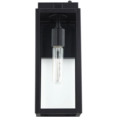 - Mystic black finish frame and backplate. Clear glass sides, open bottom, allows the bulb to be seen. Installation only with bulb facing down as shown.
