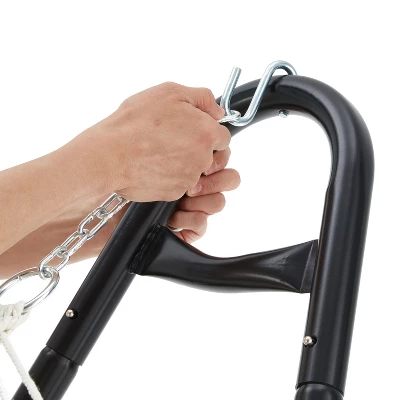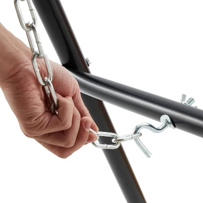 Relax out on your balcony or back patio with this Adjustable Hanging Steel Hammock Chair Stand from Jomeed.With a versatile design, this hammock stand can be used with hammocks between 9.5 to 14 feet long, giving you enough space for 2 people to relax. Stabilizing feet on each bottom corner keep the metal stand in place while you get in and out of your hammock. A black powder-coated steel design lets you use this durable stand indoors or outside on your porch, backyard, or by the pool. This easy to assemble base comes with everything you need to set up your hammock (not included) including 2 s-hooks, 2 heavy gauge hanging hooks, 4 plastic feet, and (2) 18-inch chains. With this hardware, you can hang small or large hammocks including Brazilian and spreader bar styles. Enjoy your favorite book while you relax with the Adjustable Hanging Steel Hammock Chair Stand from Jomeed.
