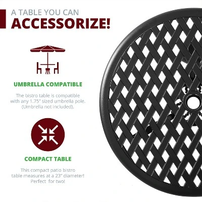 Indulge in an elegant outdoor dining experience with the Kinger Home Ekta 3-Piece Outdoor Bistro Set. Crafted with a strong cast aluminum frame, this modern patio bistro set is both stylish and durable. The round table provides ample dining space and includes a 1.75″ umbrella hole. Each bistro chair boasts a contoured seat and back for support. Pre-installed adjustable foot levelers were included for stability.