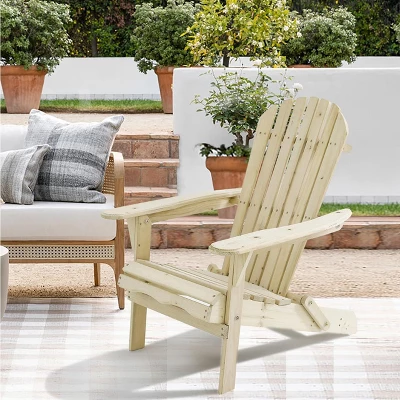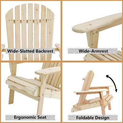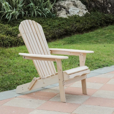 Relax outside with a cup of coffee and a good book in this sturdy and fordable Adirondack patio chair. This chair kit is designed from solid natural Canadian hemlock wood for durability, and is unfinished which creates a smooth palette for painting or staining. Once assembled, the chair weighs only 22 pounds, so you can move it around your deck or patio as needed. It is also fold-able for convenient storage. The chair also comes with all components, parts and accessories needed for assembly. This chair provides comfort and support while you enjoy the fresh air or get some sunshine. You’ll love how comfortable the rocker is and the beautiful natural wood fits perfectly in with all types of outdoor designs.Features: . . . . that is anti-corrosive and moth proof. . . Wood from well-managed forests with FSC certificate. . Care: To clean, periodically wipe the chair with a soft dry or damp cloth. Treat the wood periodically with a protectant. This will help extend the life of your wood Adirondack chair. Oil-based products last longer on wood Adirondack chairs, but are more difficult to clean up and can be more toxic to you and the environment. Water-based products are generally easier to use and clean up. You can also paint your wood Adirondack chair. Be sure to use a good primer on clean, bare wood before applying the finish coat. Paint intended for exterior locations offer the best protection, but paint will eventually peel and need to be refreshed. It is always best if you can store your wood Adirondack chair for the winter season in a dry location like a garage or shed. If you cannot store the chair, you can cover them with a weatherproof tarp or chair cover. Just make sure the chair is dry before covering. Plastic tarps can lead to mold growth or make leap, so check the condition of your chair mid-season. Specifications: Product Size: 35.8″ H x 31.5″ W x 28.1″ D Product Weight: 22 lbs. Chair Weight Capacity: 330 lbs. Product Color: Unfinished (Natural)