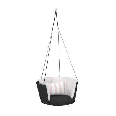 Built from durable, weather-resistant steel and wrapped in a woven wicker. Includes contrasting seat cushion and back cushion with striped lumbar pillow. Includes 2 carabiners that may be hung securely from 1 or 2 points. Rope adjusts. Keep seat 12″ to 24″ from the ground. Seating weight capacity of 250 lbs. Dimensions- Swing Seat: 36.2″ W x 32.3″ D x 15.2″ H & weighs 18.5 lbs.
