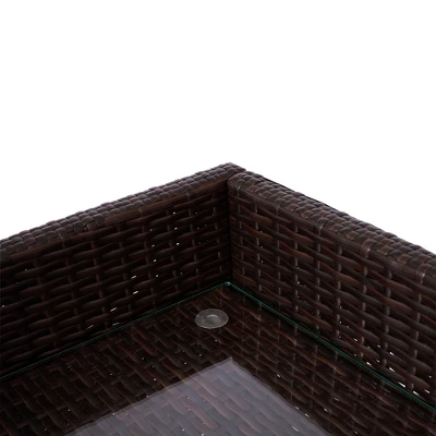 - Sturdy, dark brown UV-protected PE Rattan wrapped around a steel frame with an easy-to-clean 0.5 mm” glass tabletop